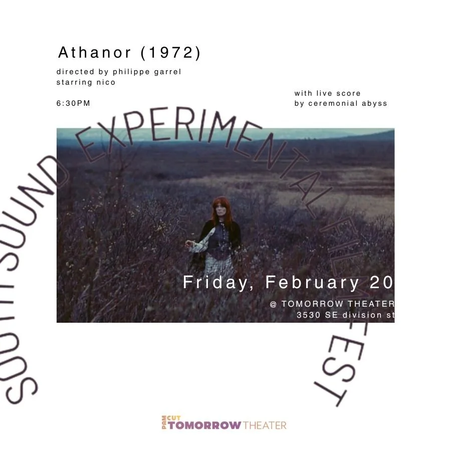 Athanor with live score by Ceremonial Abyss – Athanor is an experimental, silent, avant-garde short film by French director Philippe Garrel (1972), starring musician Nico as a mysterious figure seeking fire, exploring themes of desire, transformation, and alchemy through dreamlike, visual vignettes featuring mirrors, tombs, and castles. It’s known for its stunning, minimal, and powerful imagery, showcasing Garrel’s early artistic vision with its focus on raw, visual storytelling. A live score to this film will be provided by Portland based composer Ceremonial Abyss.